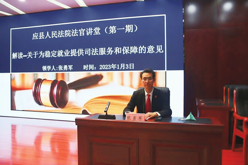 图四:1月3日,应县人民法院审判委员会专职委员张勇军为全院干警上新年第一课。