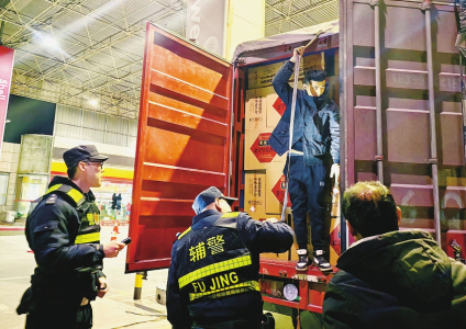 图②晋中市公安局太谷分局民辅警对过往货车进行违禁物品检查。
