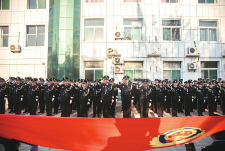 1月10日,临汾市公安机关以迎警旗、唱警歌、集体宣誓的方式庆祝自己的节日。图为临汾市公安局民警在市人民警校迎警旗。