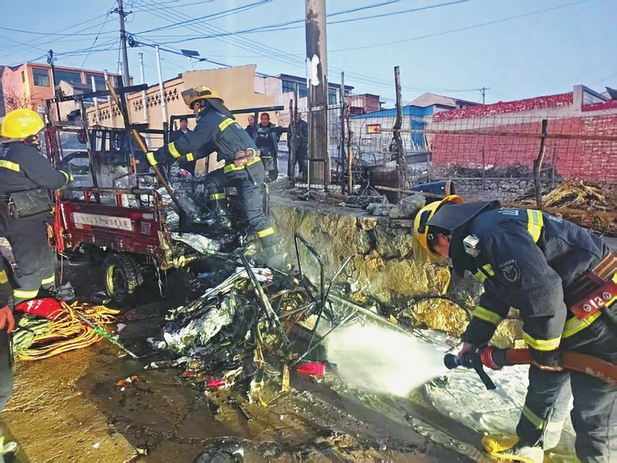 2月16日,阳泉市消防救援支队平定大队接到报警,称平定县庙沟村路旁一辆三轮车起火。消防员赶赴现场后发现,该车车斗内的废品正在燃烧。消防员遂立即出一只水枪,对准车辆着火部位进行灭火。