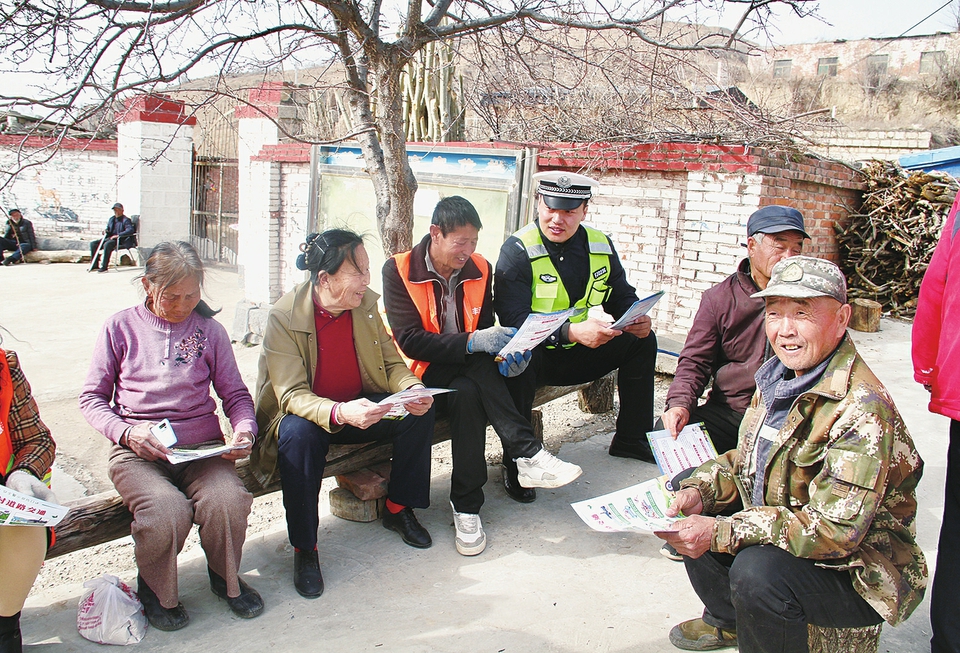 近日,方山县公安局交警大队民警走进积翠镇郝家庄村、冯家庄村,巡回宣传交安知识。本报记者李婧 通讯员马建忠摄