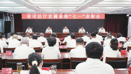 本报讯(通讯员黄泉龙)近日,省司法厅召开直属系统“七一”表彰会。省司法厅党委书记、厅长苗伟,厅党委委员、副厅长杨通顺,厅党委委员、副厅长、省监狱管理局党委书记、局长王锁成,厅党委委员、副厅长马慧健出席会议;厅党委委员、政治部主任路标主持会议。