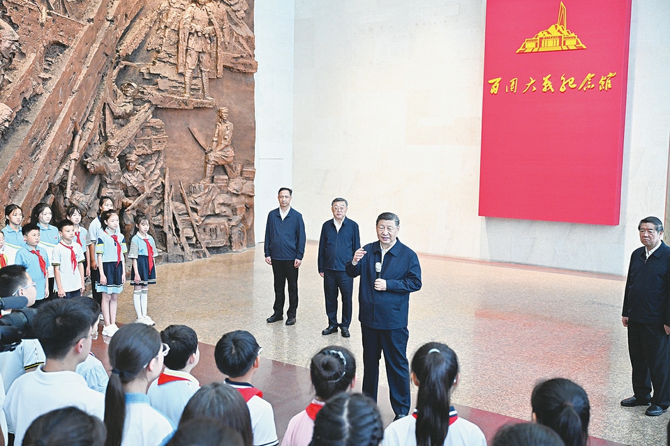 7日下午,习近平在位于阳泉市狮脑山的百团大战纪念馆考察时,同前来参观的青少年学生和纪念馆工作人员亲切交流。新华社记者殷博古摄