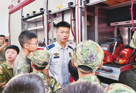图1:8月15日,80余名“兵娃”走进临汾市尧都区消防救援大队,“零距离”体验消防生活,学习安全知识。