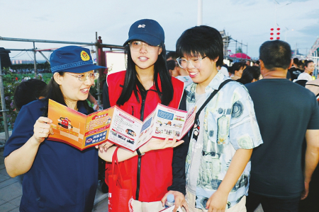 近日,运城市绛县横水镇第三届旅游文化节暨第六届荷花节开幕,吸引众多游客前来观赏。运城市消防救援支队绛县大队宣传人员抓住这一契机,将“消防课堂”搬进景区,采取“执勤+宣传”模式,全方位开展消防安全宣传活动。图为宣传人员向过往游客讲解、发放《景区消防安全手册》等宣传资料,提醒注意旅游安全事项。