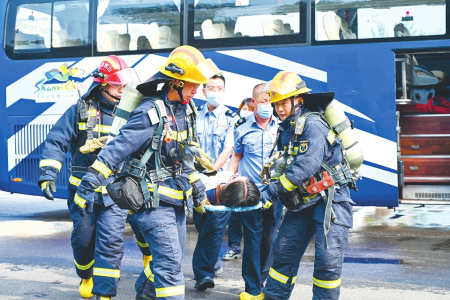 近日,阳泉市组织开展2025年交通运输突发事故应急演练,市交通运输局、公安局交警支队、卫健委、消防救援支队等多部门联合参演。 演练模拟油罐车被客车追尾,造成燃油泄漏起火、客车变形人员被困的紧急情况。消防救援人员迅速到场控制火势,交警立即实施交通管制。多部门密切配合、协同作战,成功完成人员营救、伤员转运和油罐倒罐等既定任务,取得了预期成效。