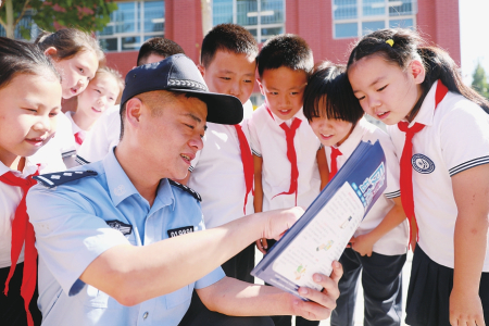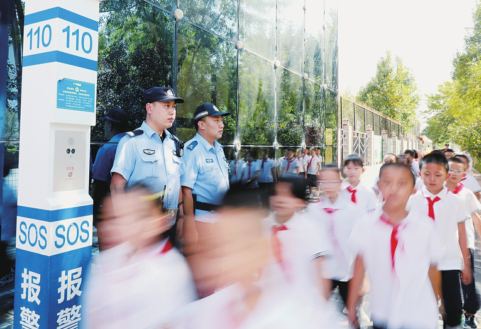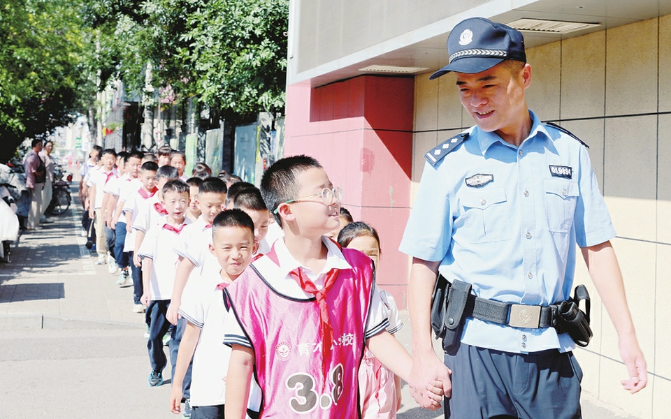9月1日,太原市各小学迎来秋季开学。 新学期第一天,太原市公安局小店分局全面开启“护学模式”,通过定点守护、动态巡逻、交通疏导、安全宣传等举措,筑牢“护学岗”安全防线,护航“神兽”平安顺利返校。图为小店派出所民警站好护学“第一岗”。
