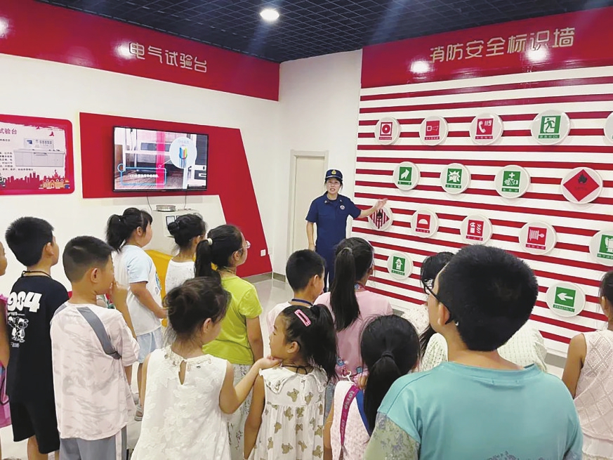近日,在阳泉市消防救援支队消防科普馆内消防安全标识墙前,辖区孩子们通过答题闯关的方式,学习各类安全标识的含义。通讯员郑肖阳摄