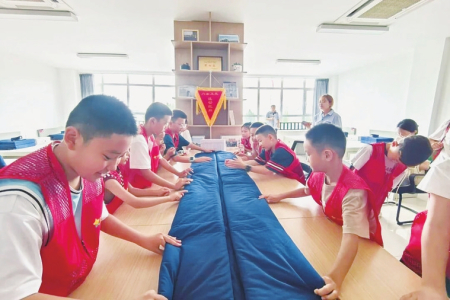 近日,在晋城市消防救援支队丹河新城消防救援站的营区,辖区学校的孩子们在消防员的指导下叠出“小方块”,感受消防队伍严谨的内务标准。通讯员韩雅男摄