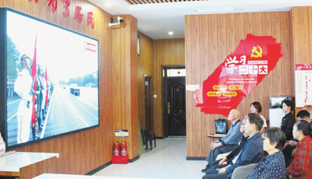 图④:闻喜县东城社区组织干部与居民代表齐聚党群服务中心,共同观看纪念中国人民抗日战争暨世界反法西斯战争胜利80周年大会直播。