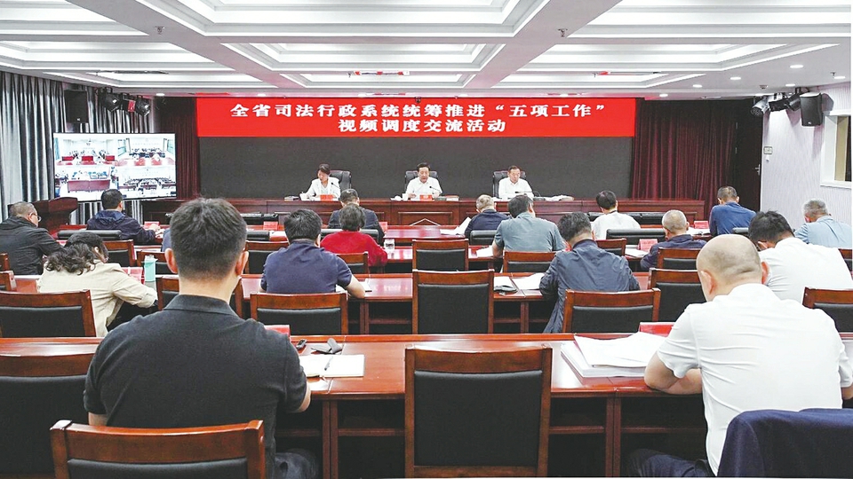 本报讯(通讯员白俊泽)9月18日,省司法厅开展全省司法行政系统统筹推进“五项工作”视频调度交流活动,深入学习贯彻习近平总书记考察山西重要讲话重要指示精神,贯彻落实省委、省政府及省委政法委关于维护社会稳定要求和司法部关于统筹推进“五项工作”部署,总结交流经验,研究部署下一步工作。厅党委书记、厅长苗伟出席并讲话,厅党委委员、副厅长,省监狱管理局党委书记、局长王锁成传达司法部紧急会议精神,厅党委委员、副厅长王素梅主持活动并安排具体工作。