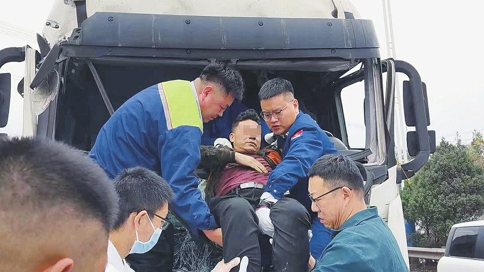 由于驾驶室变形严重,权威在钻入时双肩被车窗卡住。他只好慢慢调整身体角度,尝试用脚踹向前挡风玻璃。“一下、两下……”哗啦一声,前挡风玻璃被踹开,一条“生命通道”迅速打开。与此同时,白永杰已在车外准备好担架,并与医护人员简要交代了伤者情况。