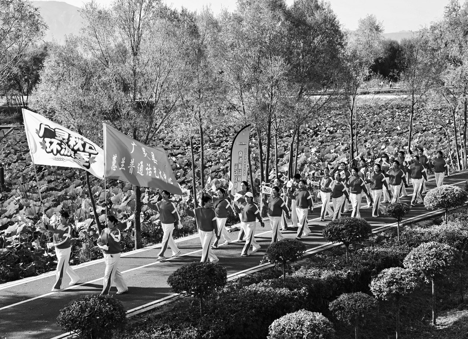 近日,广灵县800多名健身爱好者身着统一服装,沿着壶流河湿地健身步道,在晨曦中整齐健走。沿途晨练的群众纷纷加入其中,享受低碳健身的快乐。