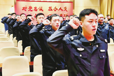 近日,太原铁路公安局大同铁路公安处2025年初任民警培训圆满结束。结业仪式上,45名新警高举右拳,进行了宪法宣誓与入警宣誓,以饱满精神面貌迎接新征程。随后,相关部门组织新警参观了处史馆、廉政教育室及党员活动荣誉室等,通过回顾公安处发展历程、感悟党建力量,为新警们上了一堂深刻的精神课。
