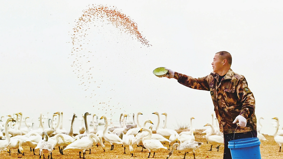 10月31日清晨,数百只天鹅在芮城县圣天湖景区沙滩上嬉戏,景区工作人员一大早就忙着给天鹅喂食。 景区负责人介绍,今冬来圣天湖栖息过冬的天鹅较往年提前了半个多月的时间。随着圣天湖生态环境日益改善和市民爱鸟护鸟意识的提高,来此越冬栖息的候鸟种群日益增加,成为圣天湖一道靓丽的生态景观。