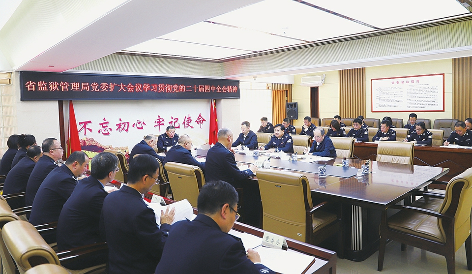 本报讯(通讯员魏建荣)10月29日,省监狱管理局召开党委扩大会议,传达学习党的二十届四中全会精神,落实省委、省政府、司法部和省司法厅要求,结合实际研究部署学习宣传贯彻落实举措。省司法厅党委委员、副厅长,省监狱管理局党委书记、局长王锁成主持会议并讲话。
