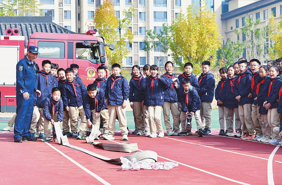 图③:消防宣传月期间,临汾市消防救援支队尧都大队20名校外辅导员上好消防体育课,让学生在增强体魄的同时学习消防安全知识。图为11月4日,临汾一中附属小学消防体育课上,学生们进行“水带保龄球”比赛。