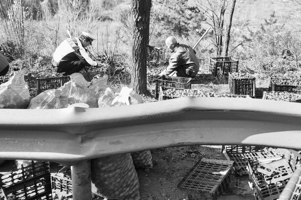 近日,在蒲县乔家湾镇五拱桥路段,一辆满载红果的货车在拐弯时发生侧翻。红果一旦长时间暴露、受损,将造成不小的损失,货车司机心急如焚。正在附近巡逻的蒲县公安局交管大队民辅警闻讯赶来。 为防止二次事故发生,民辅警立即在现场设置警示标识,引导过往车辆减速避让、有序通行。图为民警与货车司机一起清理现场。
