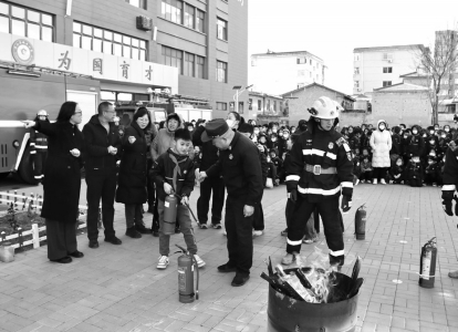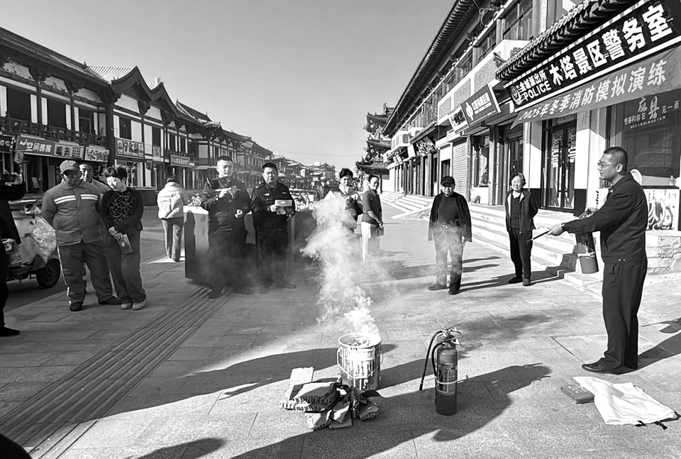 图①:近日,应县公安局金城派出所木塔景区警务室联合县消防救援大队等单位,在塔前街广场开展冬季消防演练活动。