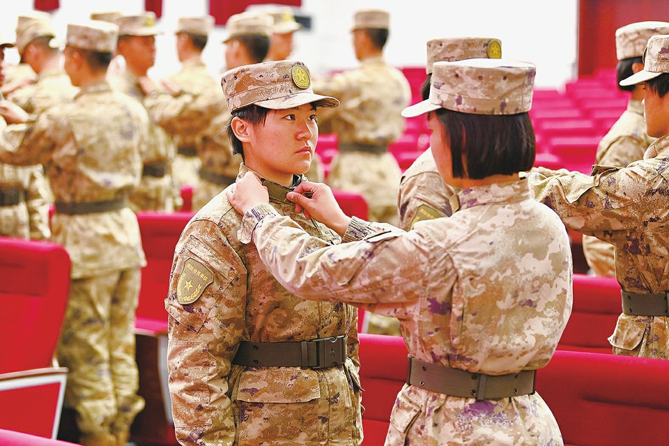 11月28日,山西省军区举行新兵授衔暨入伍宣誓仪式,50余名新战士经过加钢淬火的新训,正式被授予列兵军衔。 按照“授衔即考核”的要求,仪式结束后,新兵们全副武装直奔刺杀、手榴弹使用等实战化考核现场,用成绩证明自己的蜕变。 图为带兵骨干为新战士佩戴列兵领章并整理着装。