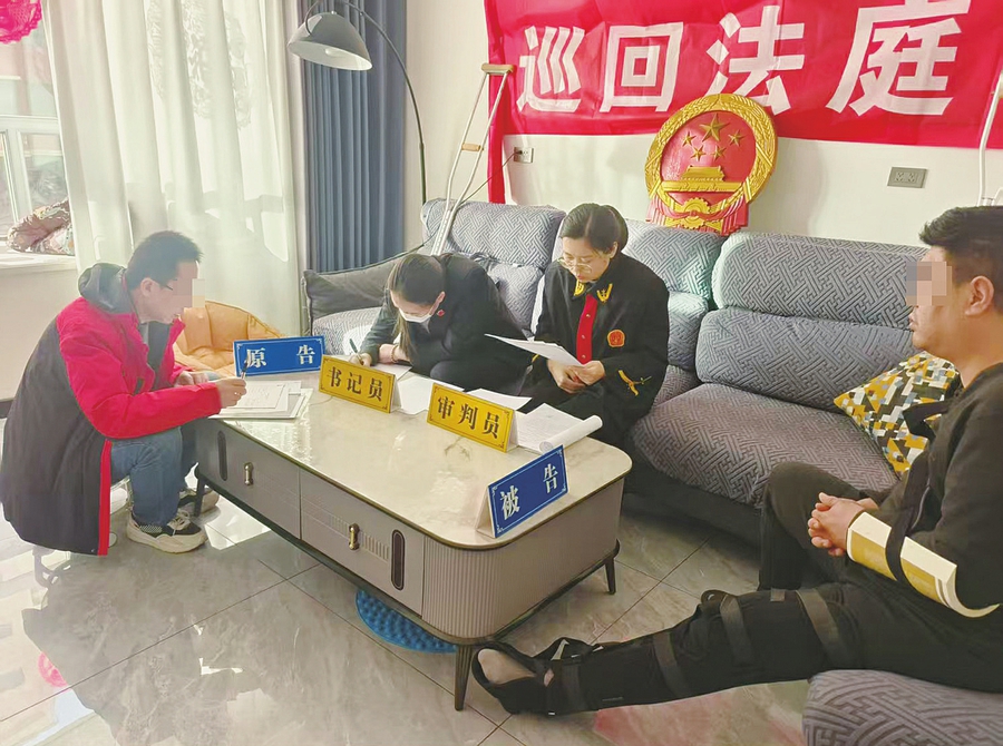 案件被告因腿部骨折,行动受限,无法按时前往法院参加庭审。承办法官在了解到这一情况后,第一时间与原、被告双方进行沟通,在征得双方同意后,法院决定采用巡回审判的方式,前往被告家中开庭审理此案。