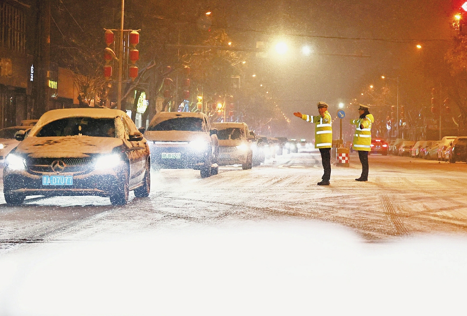 近日,华北等地出现大范围雨雪天气。在新绛县重要交通要道,当地公安交警全员上岗,在风雪夜中迎接2026年的到来。