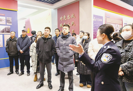 近日,晋城市公安局城区分局召开“向人民报告 请人民阅卷”2025年度向群众报告工作大会,59名“两代表一委员”、党风政风警风监督员、企业代表等社会各界代表参加大会。图为与会人员参观分局忠诚教育基地。