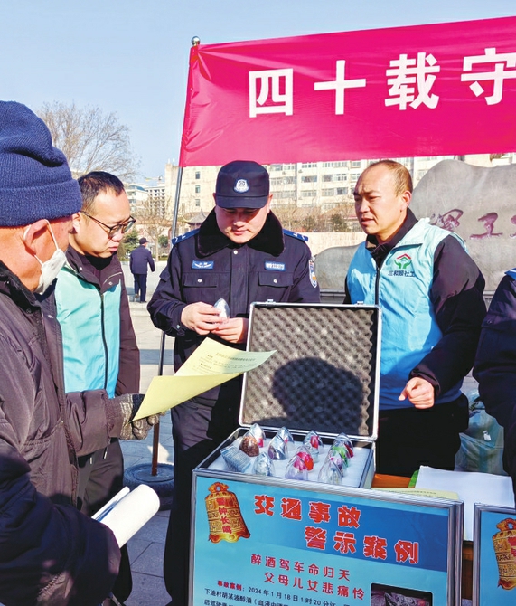1月9日,稷山县公安局组织警力在稷王文化广场开展“四十载守护平安110勇毅前行”宣传咨询活动,引导群众增强安全防范意识,主动参与到社会治安综合治理工作中。本报记者李秀荣 通讯员李东兴摄