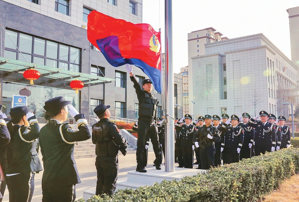 1月10日,夏县公安局举行升警旗仪式,庆祝第六个中国人民警察节。在嘹亮的警歌声中,警旗冉冉升起、迎风飘扬,全体民警肃立注目,铿锵誓言回荡现场。 通讯员张开亮 陈苗苗 张秀峰摄