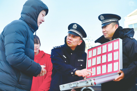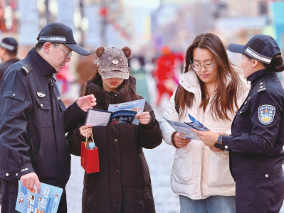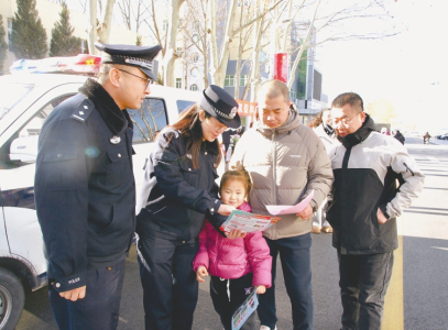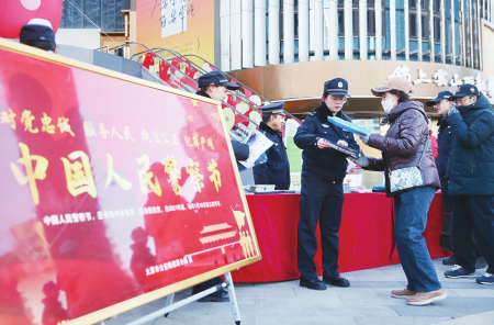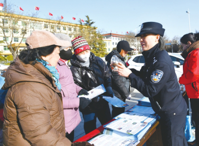 1月9日,太原市公安局迎泽分局柳巷派出所民警在钟楼街,通过设立咨询台、发放宣传资料、现场讲解等方式,向群众普及反诈防盗、治安防范等安全知识。田昕光摄