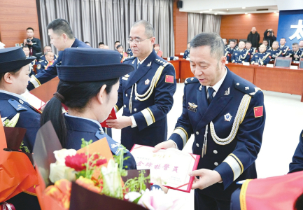 1月10日,清徐县公安局举办“一身藏蓝 一身荣耀”警营荣誉仪式,给5名女辅警发放金牌接警员证书。 本报记者赵灵芝摄