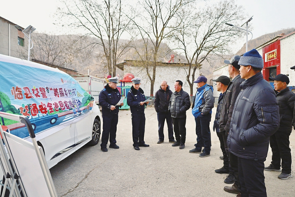 图①:1月16日,临县公安局交管大队宣传民警走进城庄镇阳宇会村,在村头广场布设宣传展板,向村民发放图文手册,用“乡音土语”讲解交通陋习的危害。