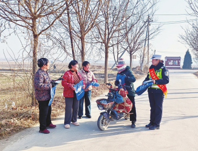 图③:1月16日,临猗县公安局交管大队民辅警在牛杜、临晋、三管等乡镇,通过向群众发放宣传资料等方式,开展“一盔一带”安全守护宣传活动。