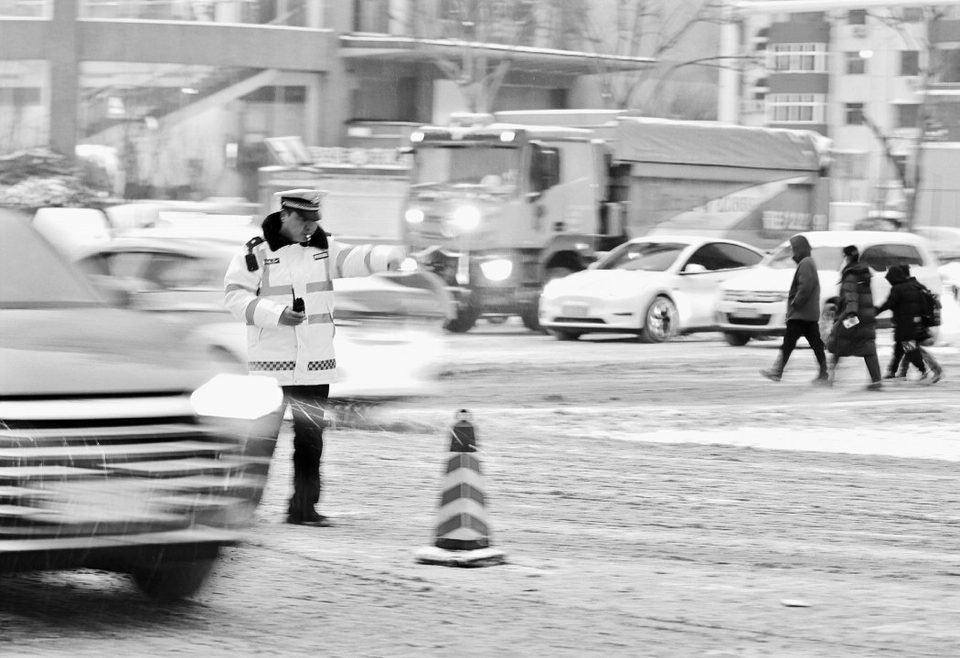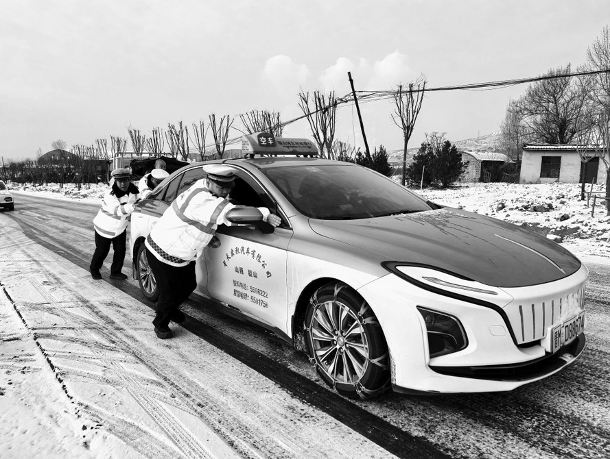 图1:1月19日晚,稷山县迎来降雪天气,稷山县公安局交通管理大队第一时间启动恶劣天气道路交通管理应急预案,多举措开展交通疏导,切实保障群众出行安全与道路通行秩序。