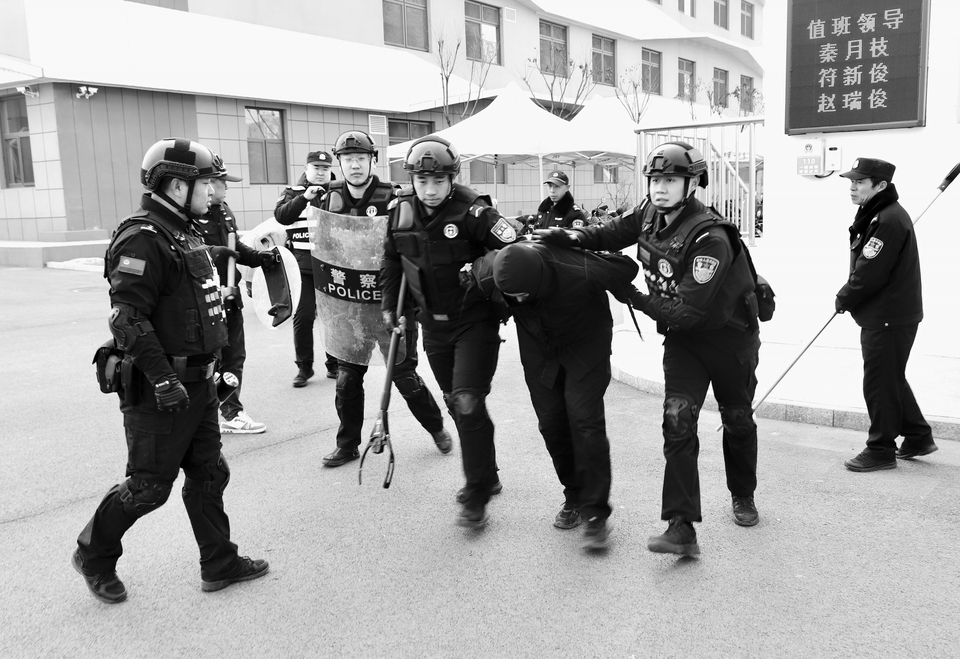 图1:近日,祁县公安局巡特警大队联合县第一小学开展反恐防暴实战演练,进一步提升校园安保力量应急处置能力,筑牢校园安全防线。