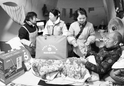 春节临近,闻喜县慈善总会组织开展了“慈善情暖万家”慰问活动。图为2月3日,闻喜县慈善总会工作人员带着棉被、米面油、慰问金等物资,走进裴社镇小王沟村82岁丁新民家中,把党和社会的关怀送到老人身边。