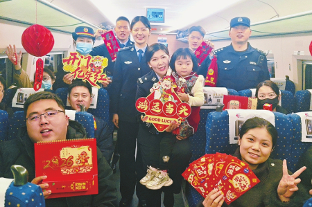 春运期间,太原铁路公安处乘警支队联合太原客运段,在列车上围绕“平安春运、温馨春运”主题开展系列宣传活动,将文艺表演、法治宣传、温情服务相结合,为旅客送上真挚祝福。图为2月9日,在太原开往北京西的G62次列车上,旅客们在欢声笑语中感受温馨旅途。