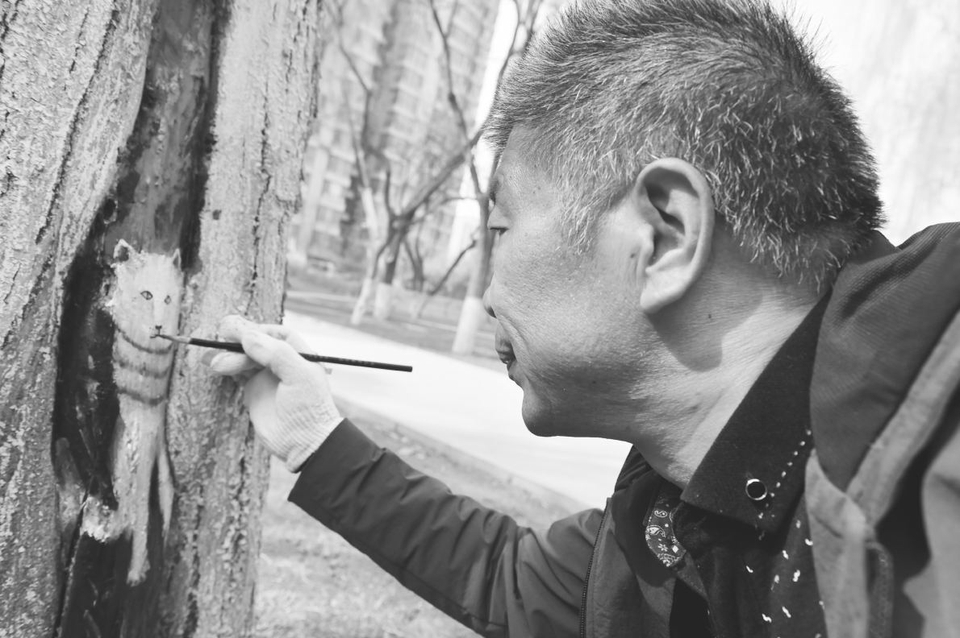 4月7日,太原市龙潭公园,一名擅长绘画的职工正在公园内大树的树洞上作画。据了解,龙潭公园内的大树树洞将全部被画上小浣熊、鹦鹉、长颈鹿等动物,远远看去,好像树洞里住上了一只只小动物。这些图案采用了丙烯颜料绘画,可以长久保留。