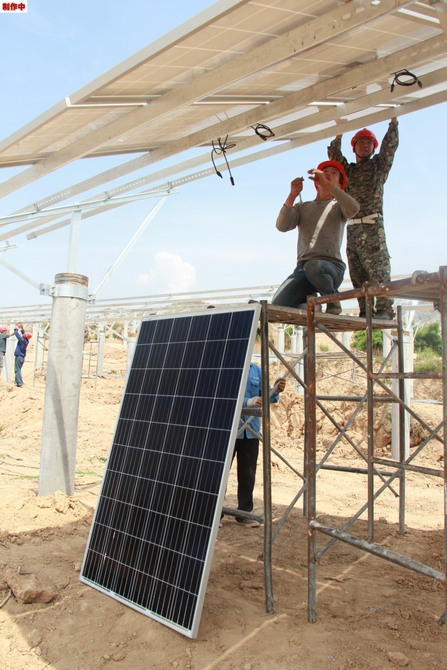 6月25日,在芮城县光伏领跑项目施工现场,技术人员正在加紧安装设备。 芮城光伏领跑技术基地是我省境内最大的集中式光伏发电站,总装机容量102万千瓦,建成后预计年发电量11亿千瓦时。