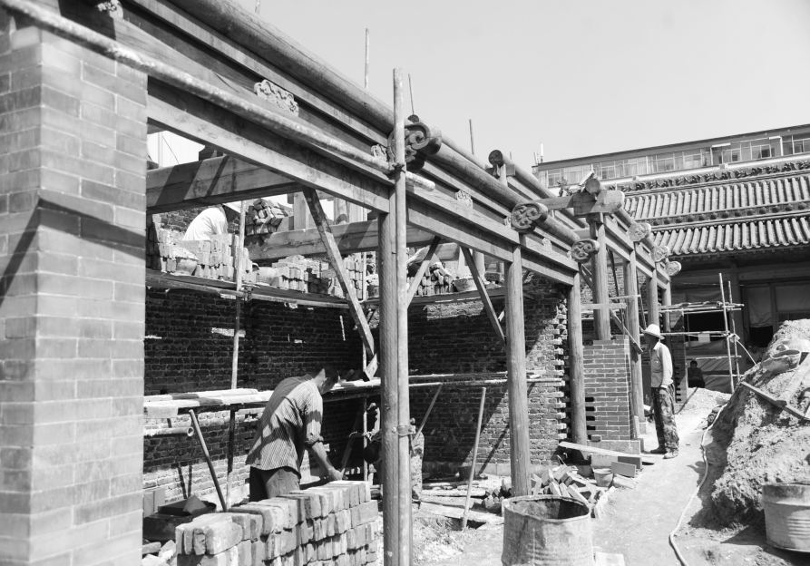 9月3日,在太原市五一路改造南华门历史文化街区修缮(复)保护工程建设工地,清末民初风格的建筑拔地而起。南华门历史文化街区经历了明晋王宫、清军营、民居等变迁,至今已有600多年历史。