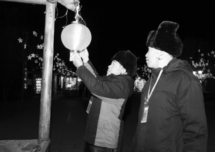 为保障武乡县首届八路军文化艺术灯会用电,近日,武乡县供电公司加强了相关线路的检查工作。 图为该公司员工在八路军文化园进行夜间巡视。