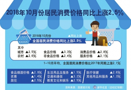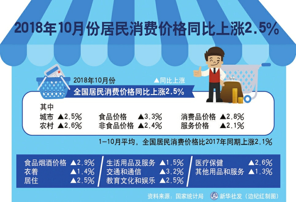 据新华社北京11月11日电(记者 陈炜伟)国家统计局9日发布数据,10月份,全国居民消费价格指数(CPI)同比上涨2.5%,涨幅与上月相同。1至10月平均,CPI比去年同期上涨2.1%。 从更能反映短期变动的环比数据看,CPI比上月上涨0.2%,涨幅比上月回落0.5个百分点。其中,食品价格下降0.3%,非食品价格上涨0.3%。 “食品价格由涨转降是CPI涨幅回落的主要原因。”国家统计局城市司高级统计师绳国庆分析称。