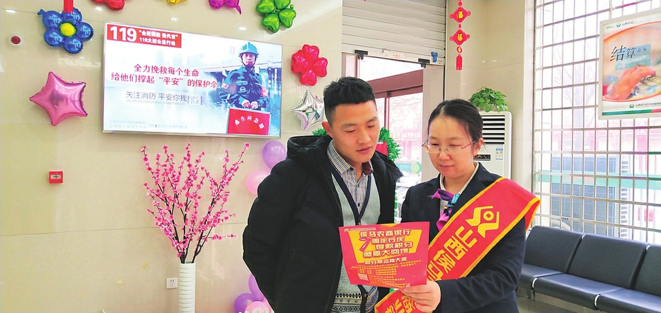 新年新气象,为迎战“首季开门红”,侯马农商行网点紧紧抓住开年契机,结合“七周年行庆,存款积分感恩大回馈”活动,积极进行全方位、多角度宣传。各项存款较年初稳步净增。 图为该行员工向客户介绍活动内容。 李庭 摄