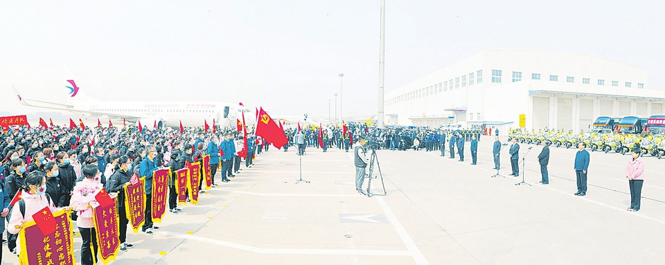 春日的武宿国际机场,阳光普照,气氛热烈。停机坪前,骑警大巴整齐排列,五星红旗迎风飘扬,“致敬‘最美逆行者’”“热烈欢迎山西支援湖北医疗队凯旋”等横幅格外醒目。中午12时,载着321名队员的两架包机平稳降落。机场以“过水门”最高礼仪为英雄接风洗尘。在激昂豪迈的《歌唱祖国》歌曲声中,医疗队员依次走下舷梯,最前面的“凯旋旗”鲜艳夺目,一面面锦旗代表了对医疗队员的最高褒奖,寄托着湖北人民的深情厚谊。舞动的国旗、热烈的掌声,汇聚成欢迎英雄平安回家的欢乐海洋,传递着众志成城战胜疫情的强大力量。