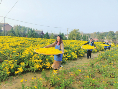 近年来,临汾市翼城县南梁镇牛家坡村大力发展村级产业,积极引进金丝皇菊优质苗,因地制宜发展特色产业。今年全村种植金丝皇菊面积近50亩,通过实施现代化管理监测等手段,确保菊花品质,亩产效益在8000元以上。图为村民正在收获金丝皇菊。