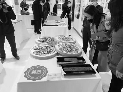 在本次展览中,内容最丰富的当属传统工艺+非遗创意设计区。一件名为《百扇孝》的展品吸引了很多人的眼球,据设计师介绍,《百扇孝》金璧由五个扇形和一个圆形组成,其设计灵感来自“善”“孝”的传统文化,设计理念寓意圆圆满满、福寿无疆。细细观看,五个扇形用榫卯与中央圆形连接,组成一个圆。扇面镂空花丝与多层浮雕虚实结合,匠心独具。另外,这一展区陈列的《醒世兽纹衍纸》作品,融合山西古建元素的皮具,选取山西青铜器中吞金兽纹、饕餮纹、凤鸟纹等经典纹饰的扎染作品,尤其是《百鸟朝凤》堆锦刺绣作品、平遥古城全景巨幅木雕,更是美轮美奂,让人眼前一亮。