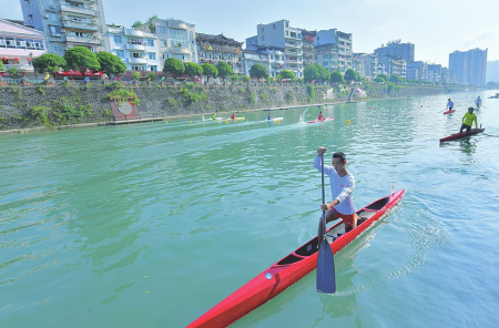 7月30日,在宣恩县仙山贡水旅游区的贡水河上,单人划艇选手进入赛道参加比赛。 近年来,湖北省宣恩县积极依托山水资源,建立皮划艇、桨板、漂流、攀岩、绳降等体育运动基地,并引入体育赛事、团队集训等,将体育运动产业与乡村旅游相结合,促进乡村振兴。