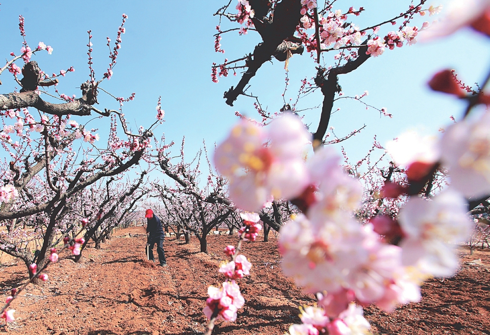 3月20日,山东省临沂市平邑县卞桥镇时家村村民在杏花园劳作。春暖花开,各地农民积极开展农事活动,田间地头一派忙碌景象。