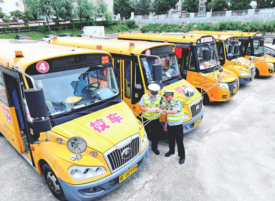 ④ 8月25日,湖北省襄阳市保康县公安局交警大队民警对校车进行安全检查。