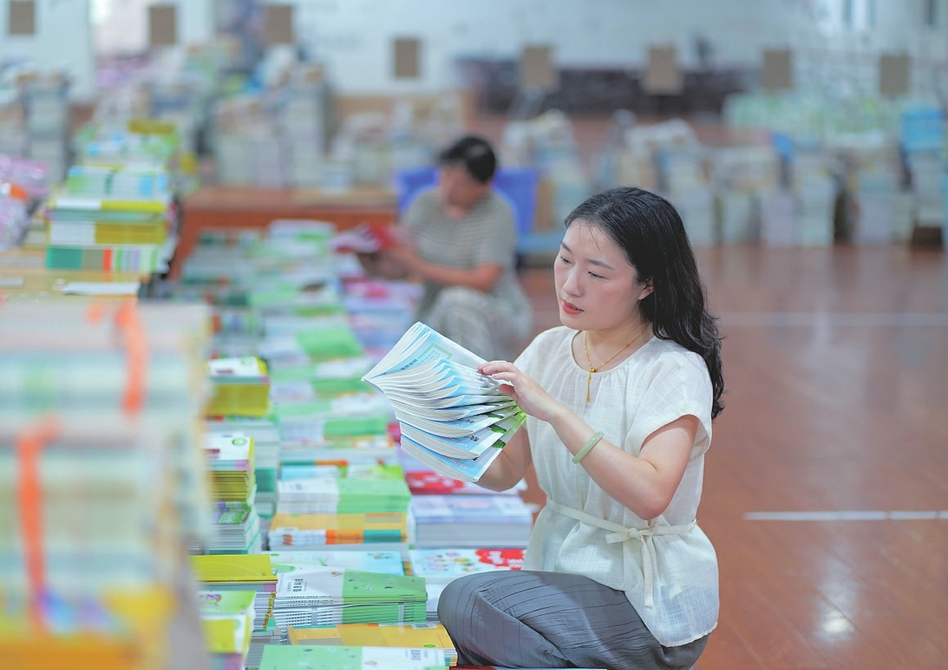 ① 8月16日,在江苏省兴化市景范学校,工作人员清点整理新学期教材。